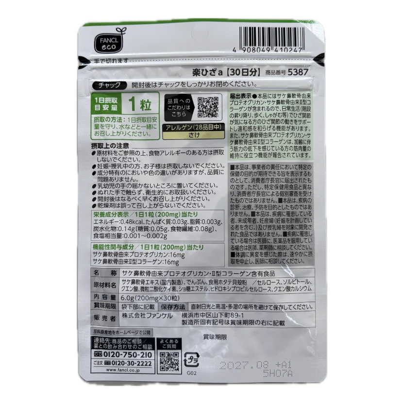 The new "Rakuhiza" is a functional food supplement rich in proteoglycans and type II collagen derived from salmon nasal cartilage, with added muscle support benefits. It relieves knee discomfort*1 and helps maintain muscle mass*2. FANCL's unique manufacturing process emphasizes ease of use and consistent consumption; only one tablet is needed daily.